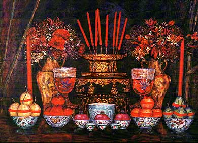 Details become the centrepiece of the artists intentional use of planes which are almost two dimensional. Every bouquet and each individual bowl is painstakingly rendered to best capture her rich ancestral past.