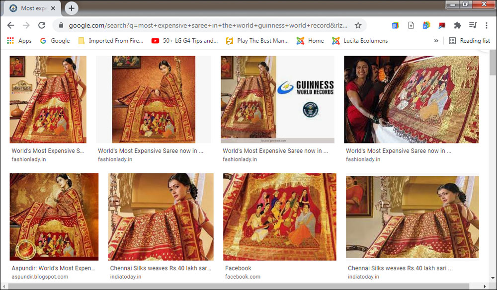 According to the Guinness World Book of Records, the most expensive silk sari was sold sold commanded a whopping price of Rs. 3,931,627 (RM 23,603; USD 47,278)) on 5 January 2008. This extraordinary creation was crafted by Chennai Silks in India and featured reproductions of 11 iconic paintings by the celebrated Indian artist Raja Ravi Varma. Among these, the centerpiece depicted Varma's renowned "Galaxy of Musicians." The making of this sari was a testament to craftsmanship, demanding a staggering 4,760 man-hours to complete.